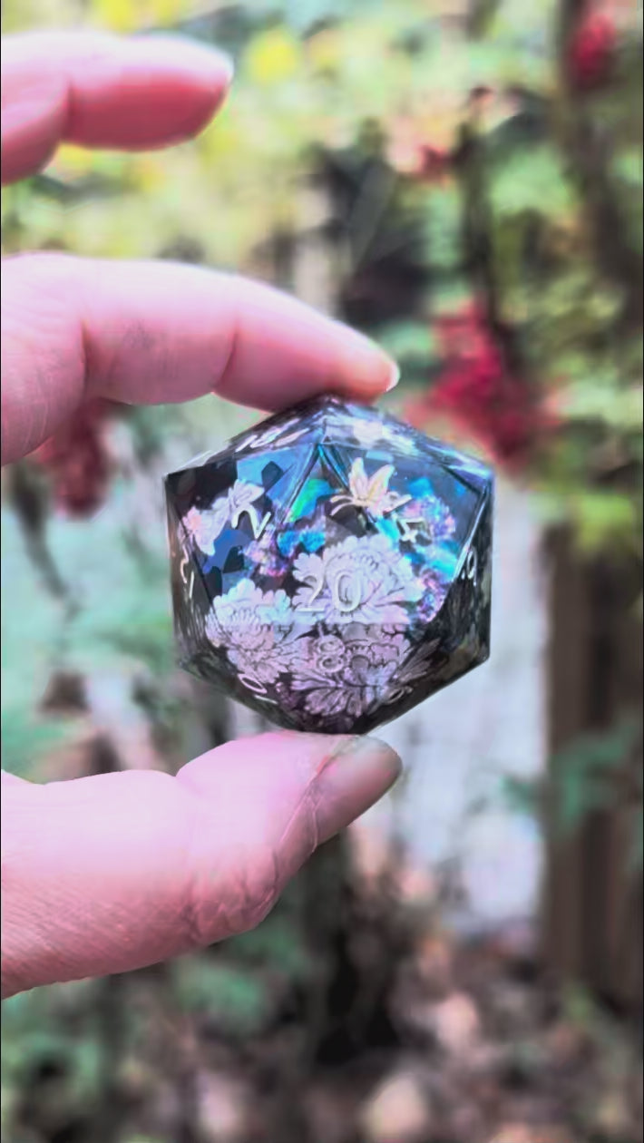 These dice are made with epoxy resin, a crystal-clear, durable material that’s perfect for showcasing detailed designs and delicate inclusions like washi tape or foil. It has a warm, glass-like finish that feels great in the hand and looks stunning on the table.