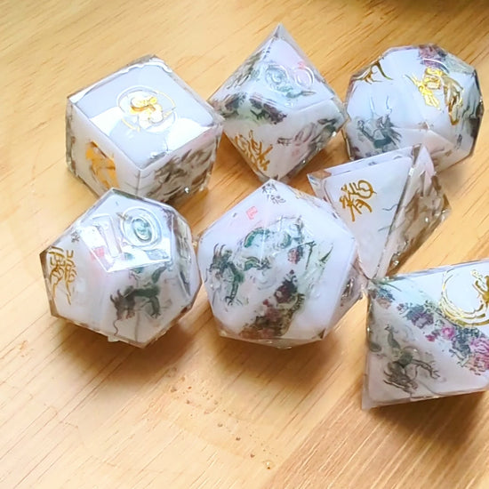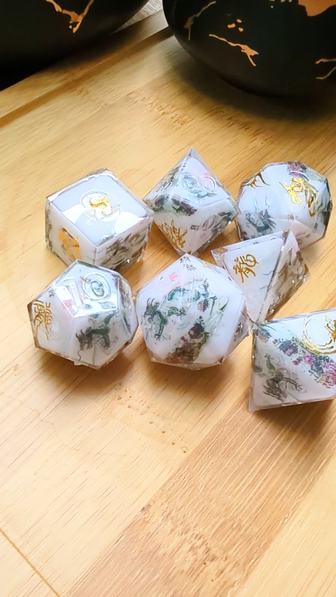 These dice are made with epoxy resin, a crystal-clear, durable material that’s perfect for showcasing detailed designs and delicate inclusions like washi tape or foil. It has a warm, glass-like finish that feels great in the hand and looks stunning on the table.