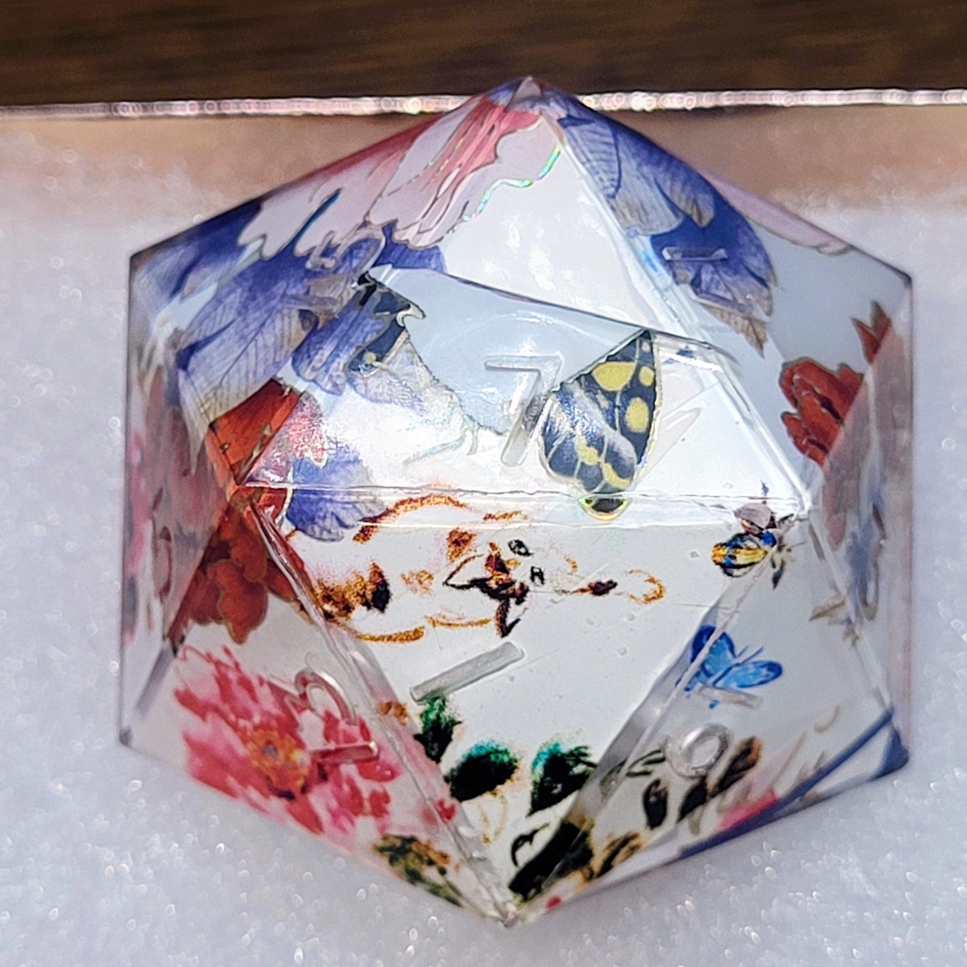 These dice are made with epoxy resin, a crystal-clear, durable material that’s perfect for showcasing detailed designs and delicate inclusions like washi tape or foil. It has a warm, glass-like finish that feels great in the hand and looks stunning on the table.