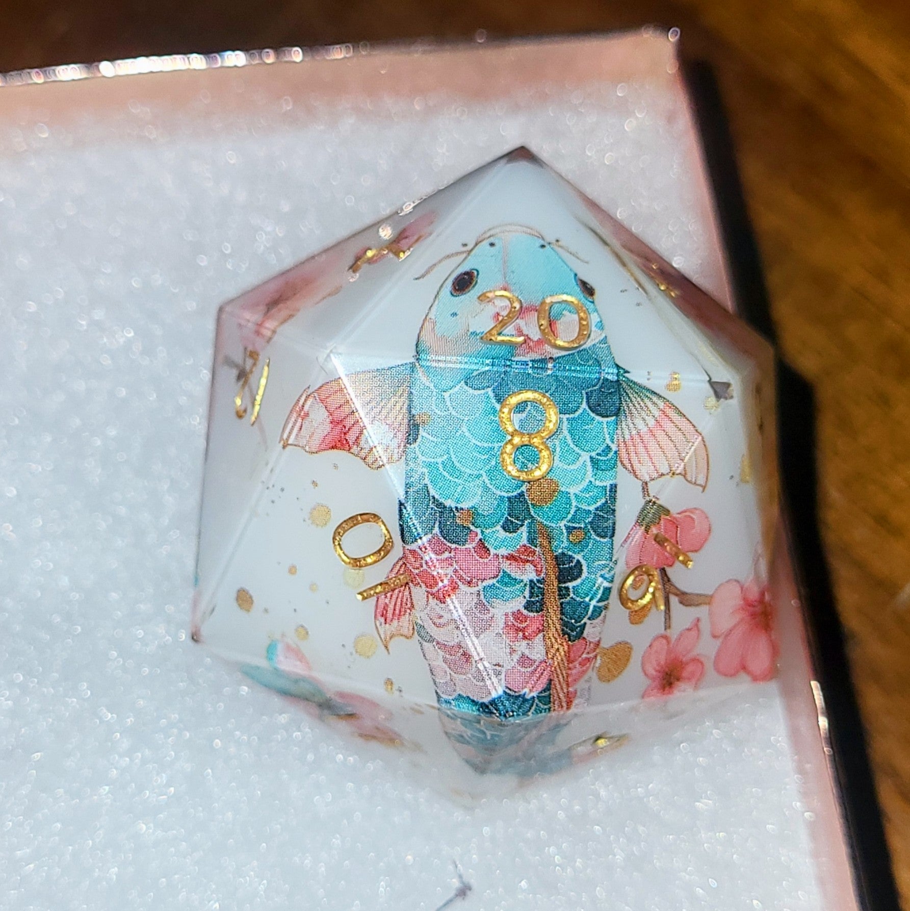These dice are made with epoxy resin, a crystal-clear, durable material that’s perfect for showcasing detailed designs and delicate inclusions like washi tape or foil. It has a warm, glass-like finish that feels great in the hand and looks stunning on the table.