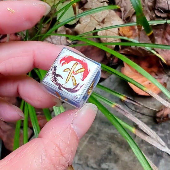 Koi fish swimming in Taichi circle. D6 dice in numerical numbers. Fish is an orignal painting by Joanna Liu.