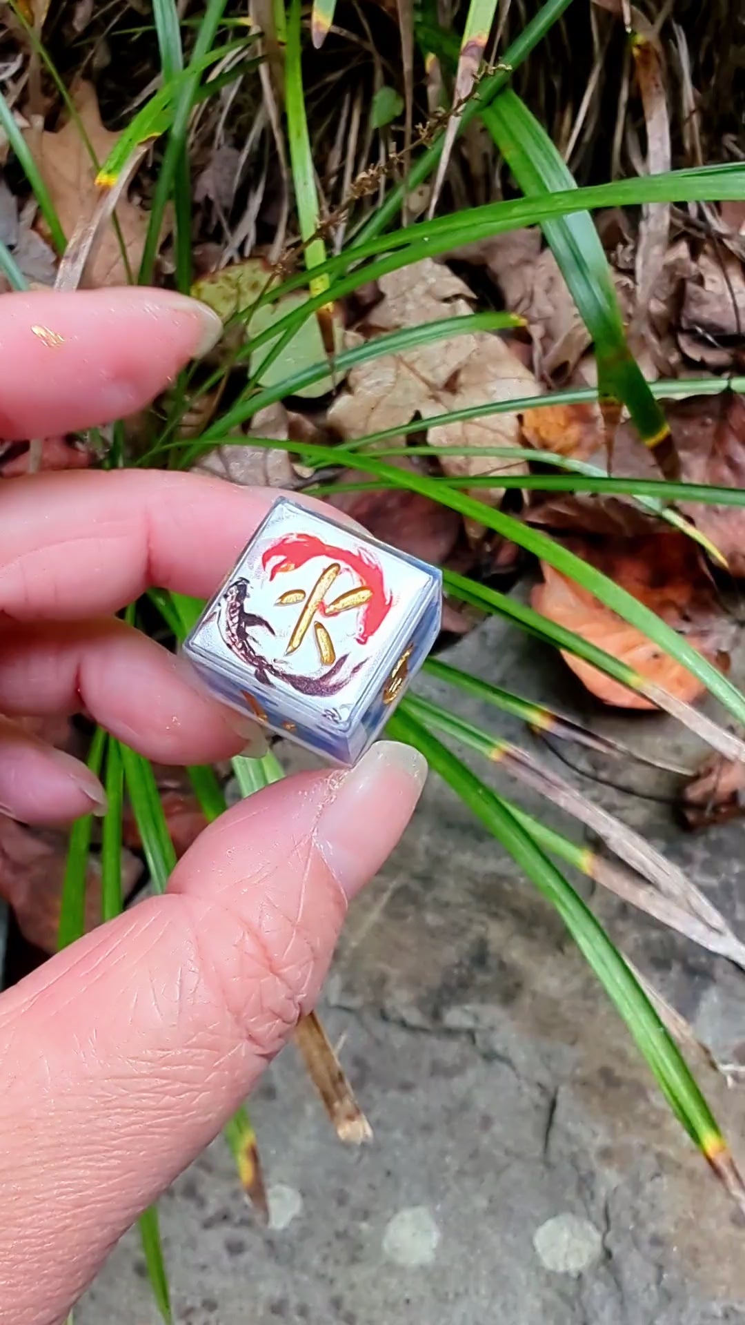These dice are made with epoxy resin, a crystal-clear, durable material that’s perfect for showcasing detailed designs and delicate inclusions like washi tape or foil. It has a warm, glass-like finish that feels great in the hand and looks stunning on the table.