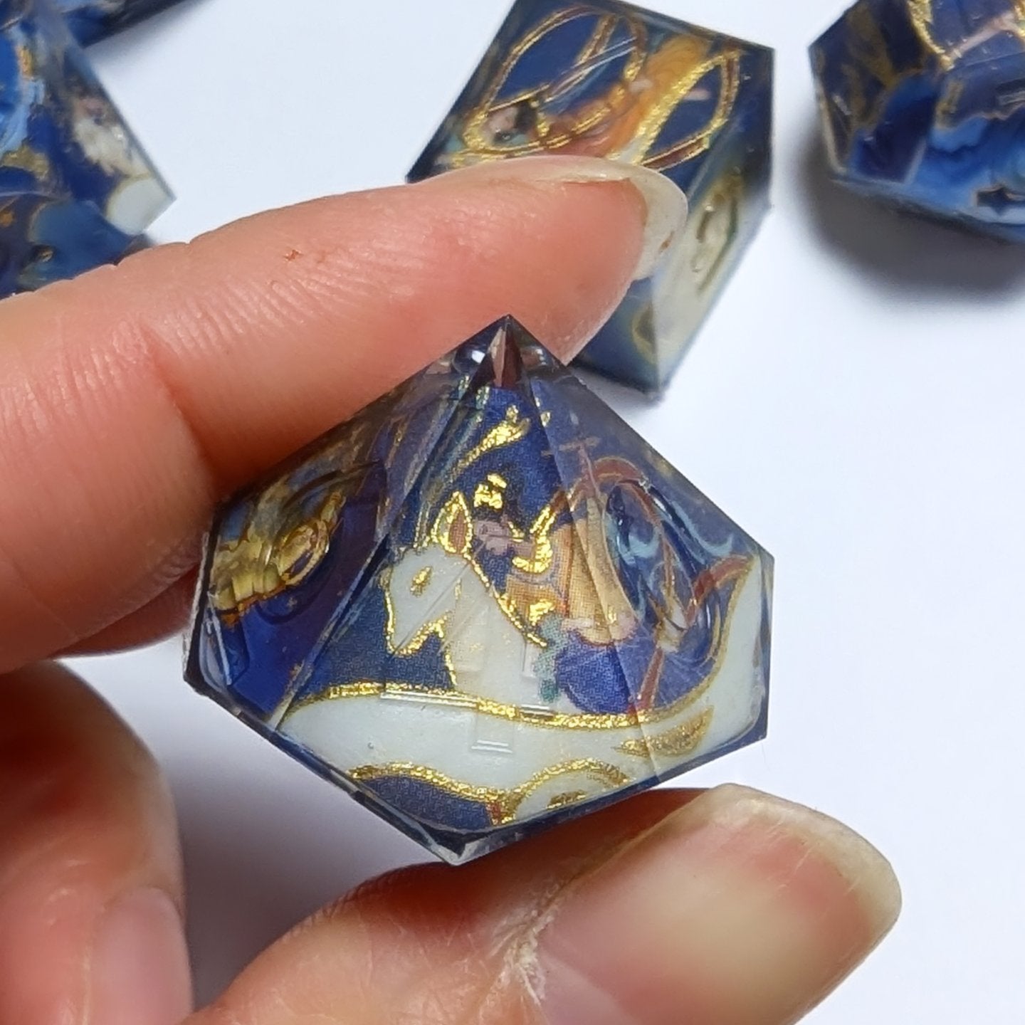 These dice are made with epoxy resin, a crystal-clear, durable material that’s perfect for showcasing detailed designs and delicate inclusions like washi tape or foil. It has a warm, glass-like finish that feels great in the hand and looks stunning on the table.