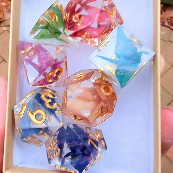 Dice inclusions are paper cranes. They may not be perfectly balanced because the material is paper. I follow "wabi sabi" principle, finding the beauty in imperfection of the art form. If you want absolute factory level perfection, my handmade dice are not for you.
