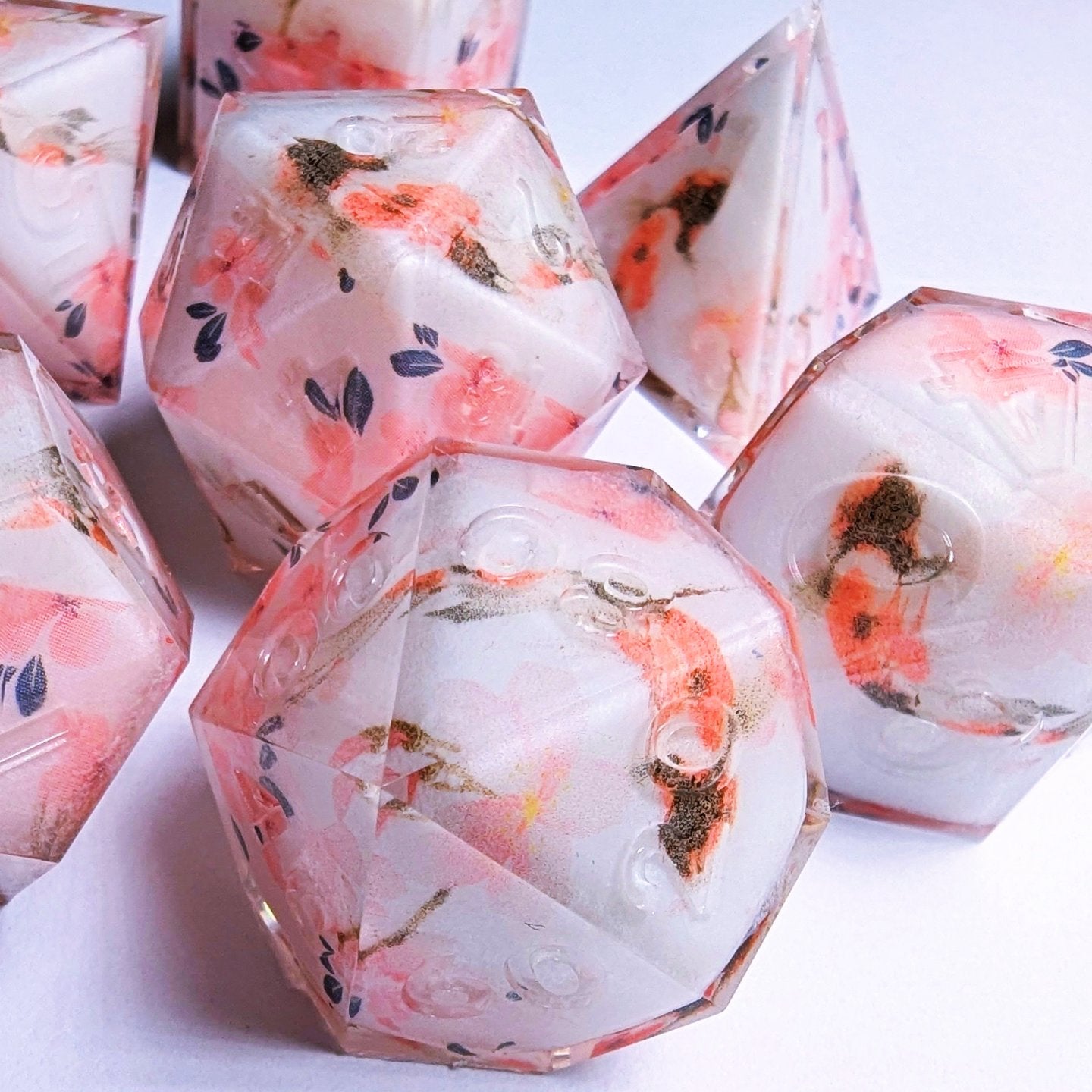 These dice are made with epoxy resin, a crystal-clear, durable material that’s perfect for showcasing detailed designs and delicate inclusions like washi tape or foil. It has a warm, glass-like finish that feels great in the hand and looks stunning on the table.