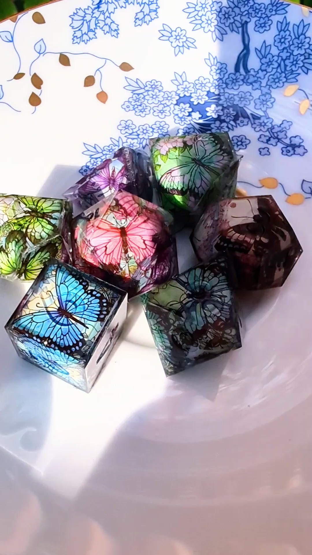 These dice are made with epoxy resin, a crystal-clear, durable material that’s perfect for showcasing detailed designs and delicate inclusions like washi tape or foil. It has a warm, glass-like finish that feels great in the hand and looks stunning on the table.